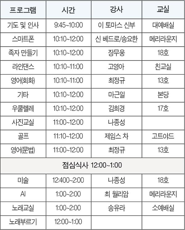 수업은 교회 교육관에서 진행된다. 강좌는 스마트폰 초·중급 과정, 족자 만들기, 라인댄스, 영어 회화, 영문법, 기타 교실, 우쿨렐레, 사진 교실, 골프, 미술, AI, 노래 교실(노래 배우기 및 노래방) 등으로 구성됐다. 다양한 특강도 마련될 예정이다.
